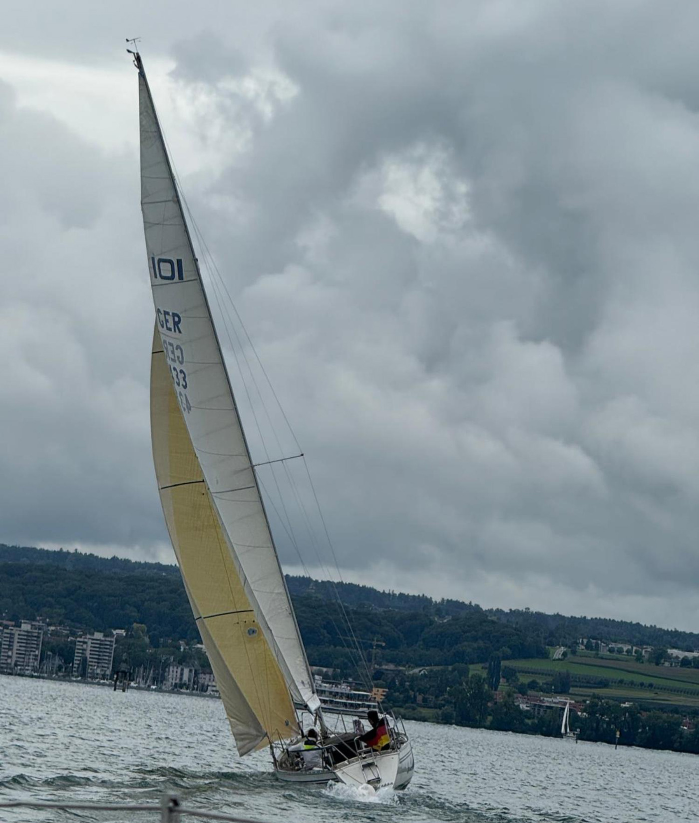 Am nächsten Morgen trafen wir uns zur Steuerleute Besprechung. Wichtigster Teilnehmer war die Regenradar Vorhersage von Meteo Swiss. Es konnte eine Regenlücke gefunden werden. Die erste Etappe wurde als Zeitfahren bei sehr gutem Wind von Sipplingen bis zum Seezeichen 18 (das kommt nachher nochmal vor) beim Fließhorn ausgetragen. Den schnellsten Weg fand die Crew der La Chiappa. Dann begann das zweite Rennen des Tages. Wer schafft es vor dem angekündigten Regen im Hafen die Persening anzubringen.
