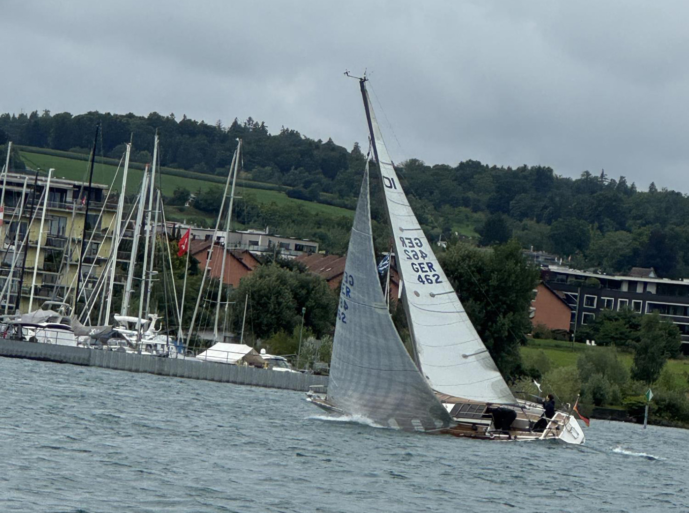 Der nächste Morgen begann mit einem Knalleffekt. Ein Blitz schlug in der Nähe ein und weckte uns mit einem mächtigen Donnerknall. Bei der Steuerleutebesprechung wurde die nächste Route festgelegt. Zeitfahren, Start um 11 Uhr vor dem Hafen, Ziel Tankstelle Bottighofen. Wieder toller Wind, direkter Anleger auf Bottighofen. Über die Fährelinie schafften es (fast) alle ohne Komplikationen. Eine IOI drehte aufgrund des ungleichen Kräfteverhältnisses lieber vor der Fähre ab und drehte eine Runde. Wir kamen auch gut am Glockenschlag vorbei und steuerten Richtung Bottighofen. Wir waren in einem Pulk mit vier IOIen nebeneinander. Der Hafen kam immer näher und näher. Es kam dann irgendwann bei uns die Frage auf, wann wir die Zeit nehmen sollen.