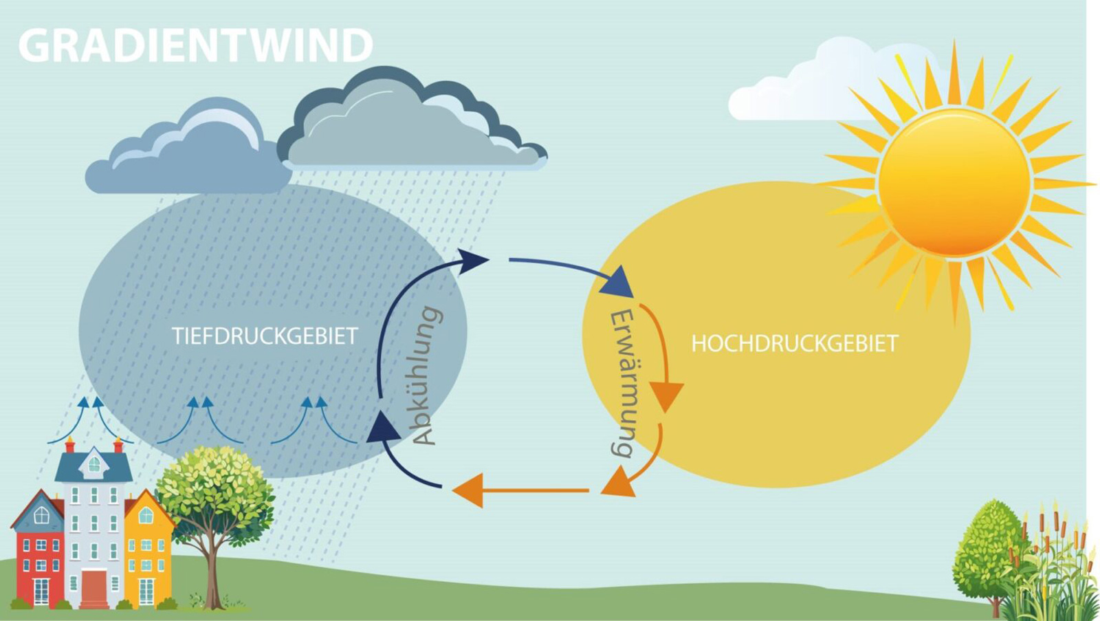 Bevor wir auf die beiden Hauptwindsysteme (Gradient und Thermik) am Bodensee eingehen, ist es notwendig zu verstehen, wie Wind ganz allgemein entsteht. Durch die Sonne wird die Erdoberfläche erwärmt, wenn dies unterschiedlich schnell passiert, führt das zu Druckunterschieden der Luft. Eine dunklere Oberfläche erwärmt sich also beispielsweise schneller, wodurch in diesem Gebiet die warme Luft beginnt aufzusteigen. Wenn warme Luft aufsteigt, sinkt der Luftdruck und kühlere Luft strömt nach – es weht Wind.