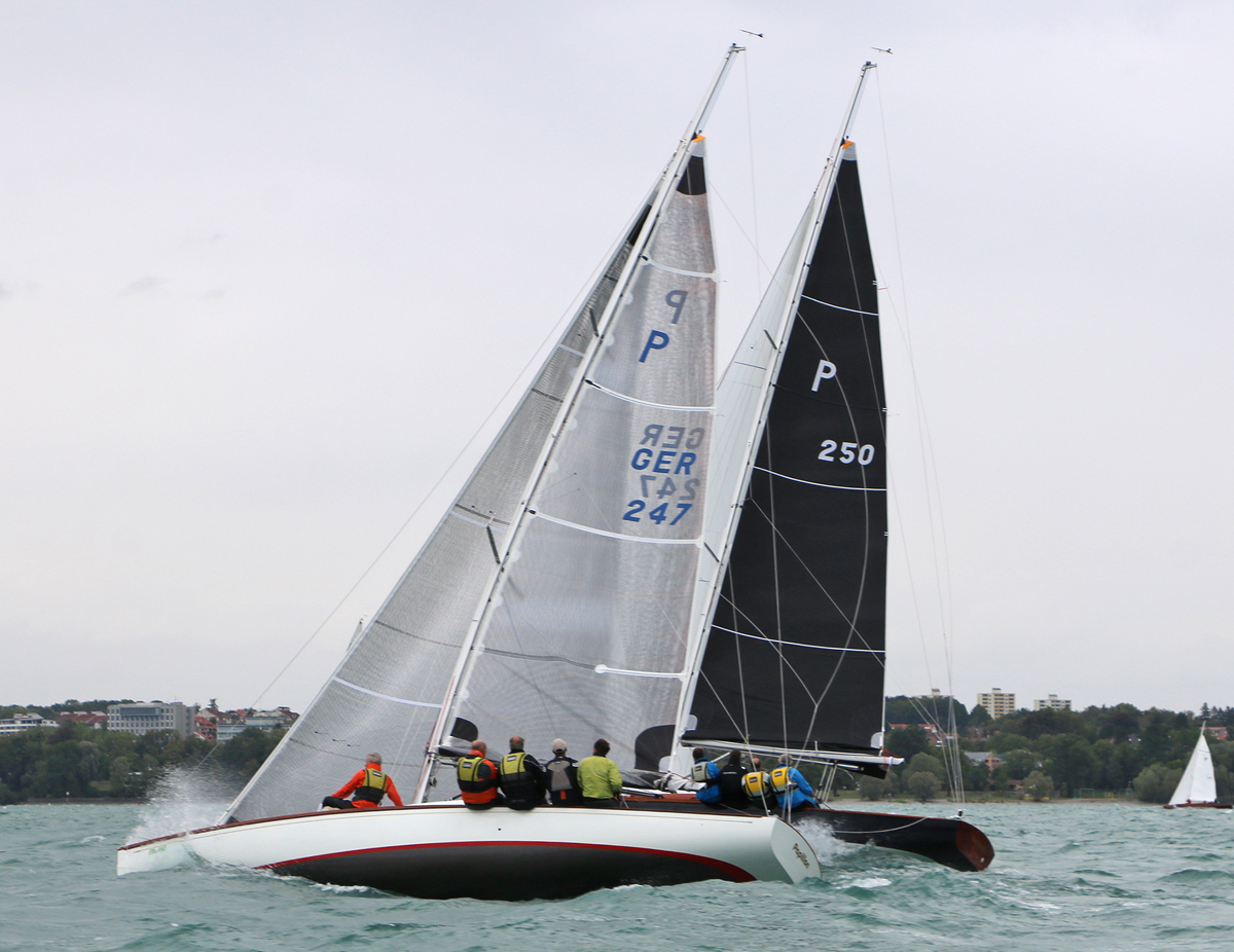 Markus Glas auf P250 „Naseweis“ gewann den Europapokal der 45 qm Nationalen Kreuzer vor Christian Dornier auf P 243 „Unsa“, der in den letzten beiden Wettfahrten vorne war und insgesamt Zweiter wurde. © Volker Göbner
