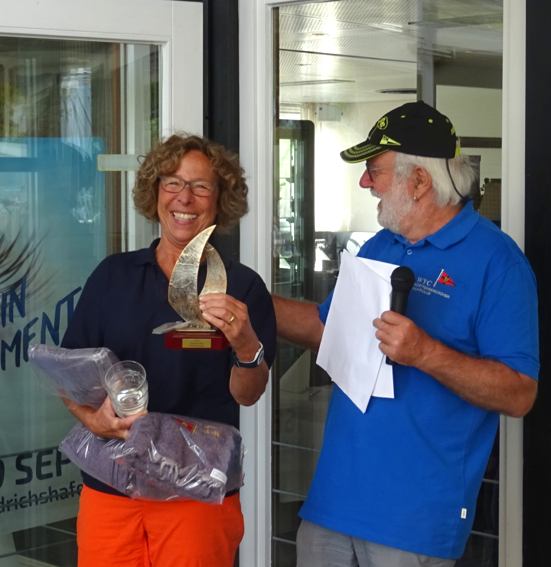 Gabi Rütten gewann den Damenpokal des WYC bei den Fahrtenseglern; ihr gratuliert Wettfahrtleiter Günther Widmer. Foto: © Philipp Schurer/WYC