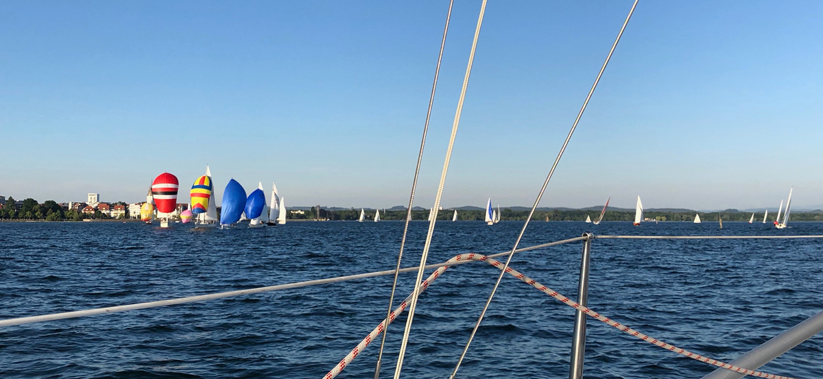 Seit dem 10. Juni finden wieder Mittwochsregatten vor Friedrichshafen statt. Rund 30 Boote waren bei den ersten beiden Terminen am Start, beim dritten bereits 43 Teams. Auf dem Wasser ist es kein Problem, die Abstandsregeln einzuhalten – und der Spaß am Segeln steht im Vordergrund. Foto: © M. Lange/WYC