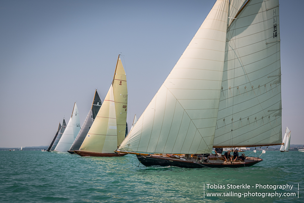 06.07.2018: Zwei weitere Rennen wurden am Freitag, dem fünften und vorletzten Tag der Weltmeisterschaft der 8mR-Yachten auf dem Bodensee beim Yacht Club Langenargen, gesegelt.